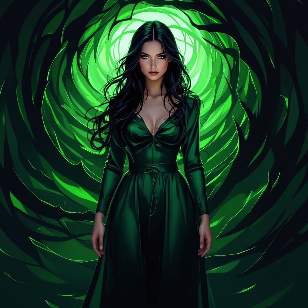 This image shows a full-body portrait of a beautiful young woman with long, dark hair. Shadows swirl around her as she stands elegantly in a moss agate colored silk dress.