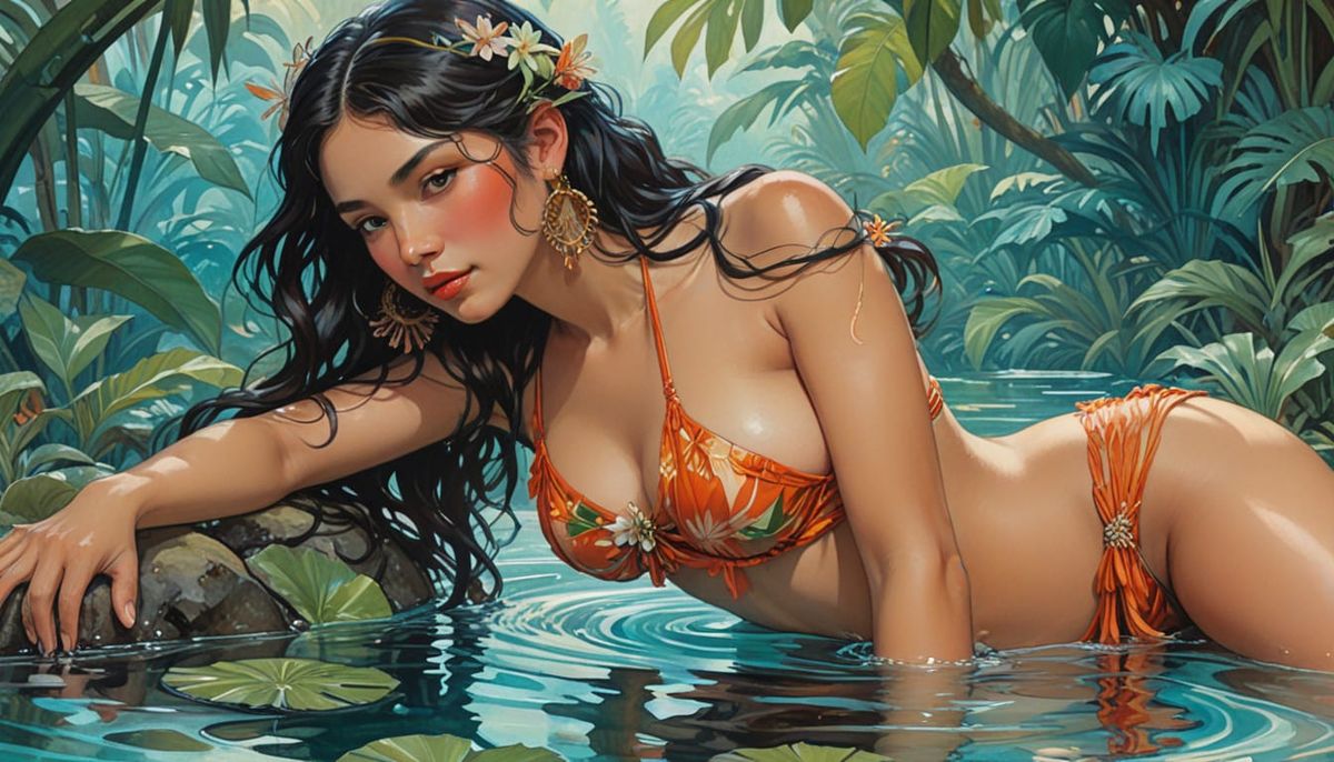 This image shows a beautiful hula dancer bathing in a lagoon with a lush jungle background. It features vibrant tropical colors and intricate details in an enchanting, whimsical style.