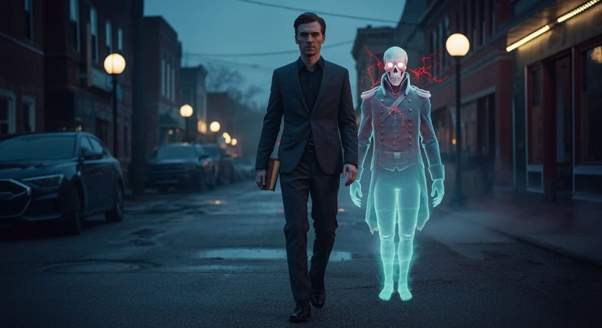 A striking picture of a Polish-American man and ghostly specter walking in a city at dusk. The scene blends modern elements with supernatural touches, rendered with a cinematic, moody tone in charcoal and blue hues.