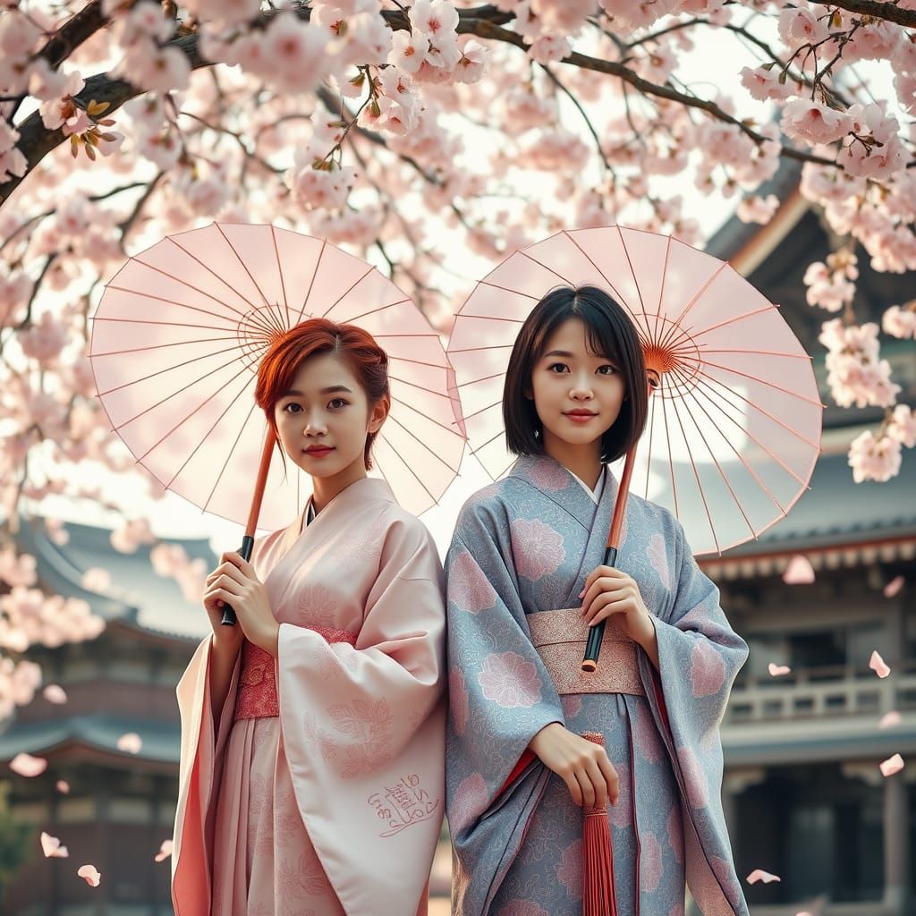 This image captures two young women in exquisite yukatas, surrounded by blooming cherry blossoms and a traditional Japanese temple, creating a serene and dreamy atmosphere with intricate details and vibrant colors.