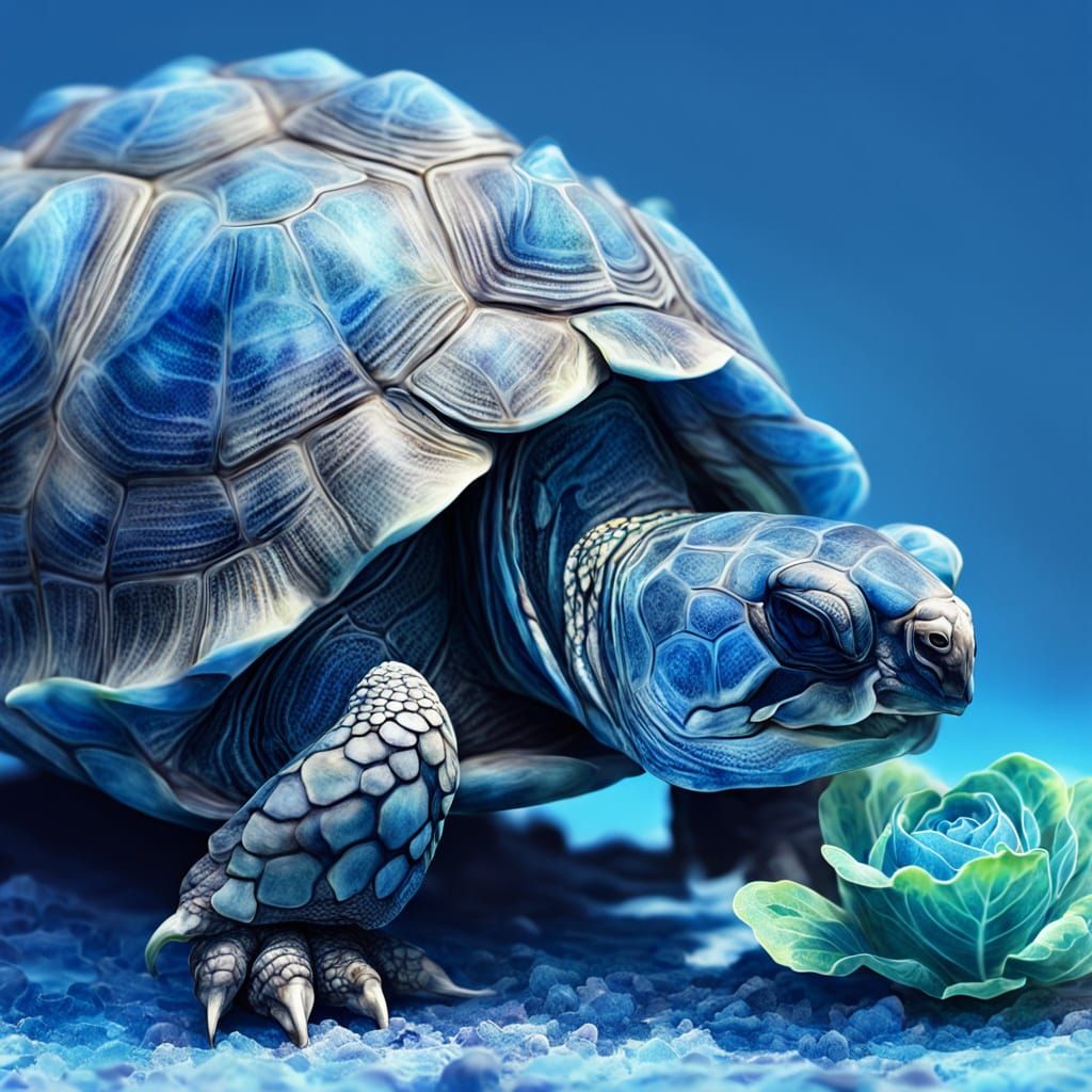 A close-up digital painting of a blue tortoise eating blue lettuce. The vibrant, detailed macro photograph features an iridescent shell, soft leaves, and a gentle mist in pastel colors.