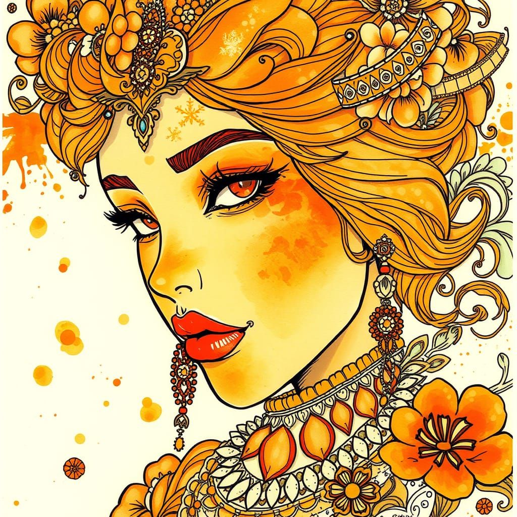 A vibrant manga illustration featuring elaborate line work and ornate details. Expressive ink textures and watercolor blends create a dynamic, orange-hued image in a manga aesthetic.