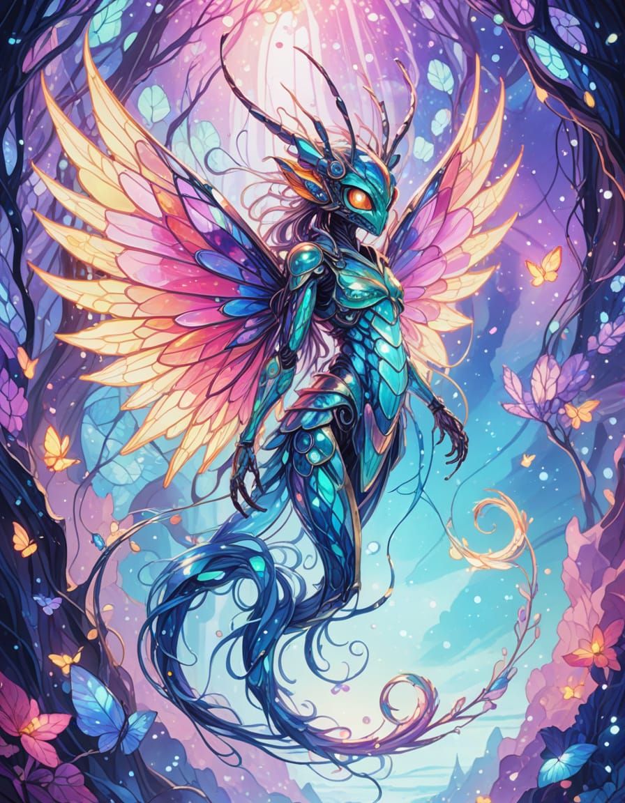 A striking picture of an insectoid creature with luminous fairy wings. This macro shot showcases vibrant, glowing colors, intricate zentangle patterns, and a warm, iridescent aura in a psychedelic manga style.