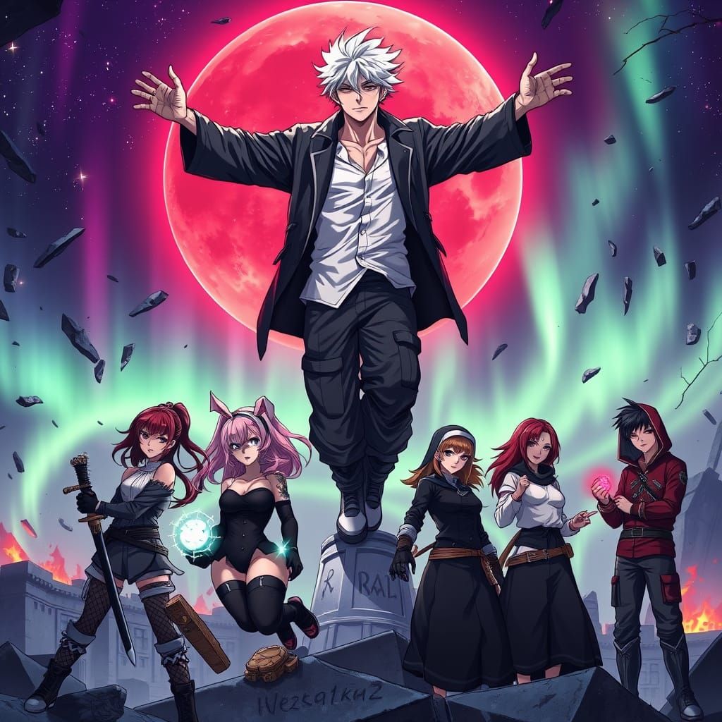 A majestic figure with glowing eyes and a serene expression hovers above a team of fierce warriors, each with their own unique abilities and styles, set against a backdrop of a shattered celestial sky and broken ruins, in a vibrant anime style with intricate details and dramatic effects.