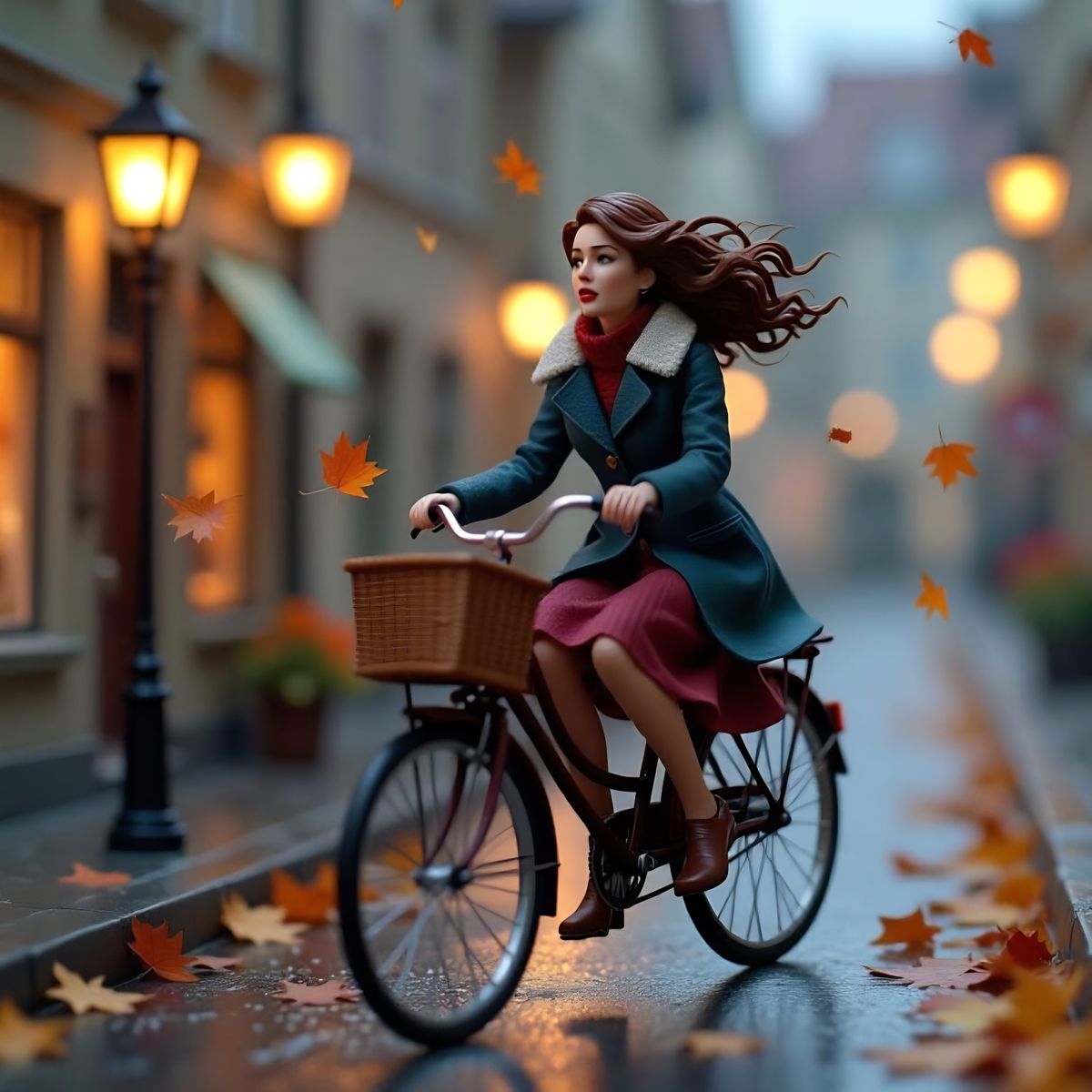 This image shows a miniature scene of a woman cycling through a European city street during a heavy autumn storm at night, with leaves and wind creating a cozy diorama effect.