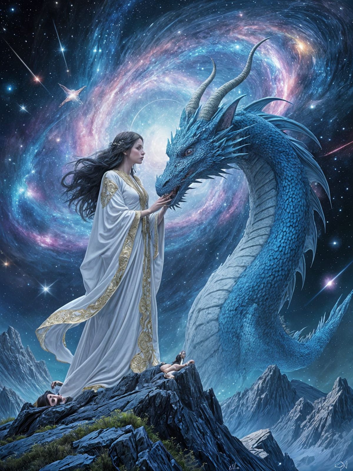 This image shows a witch standing on a mountaintop, gently rubbing the jaw of her blue dragon. The sky above them is filled with swirling galaxies and shooting stars, rendered as a cosmic illustration.