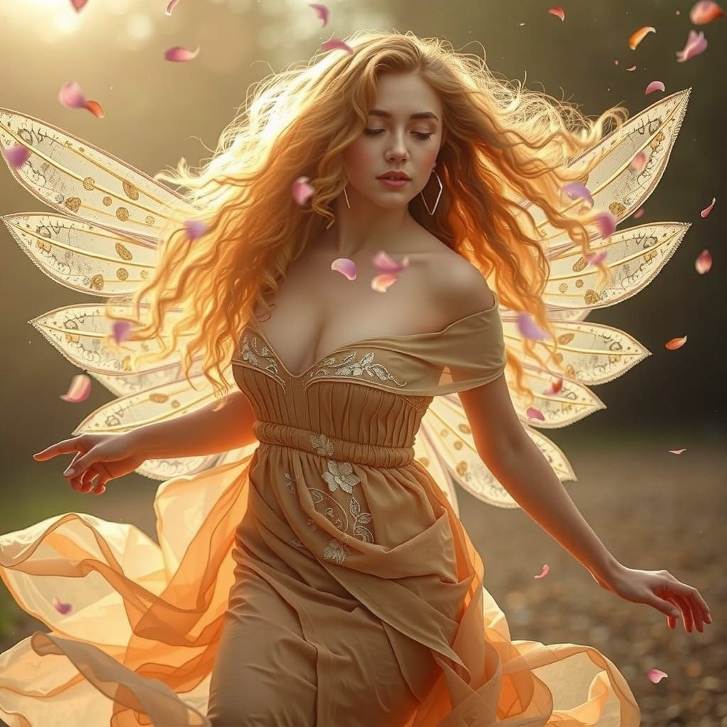A captivating image of a woman with golden hair and fairy wings dancing with nature. She wears a flowing melon dress as flower petals fall, rendered with whimsical elegance and vibrant colors.
