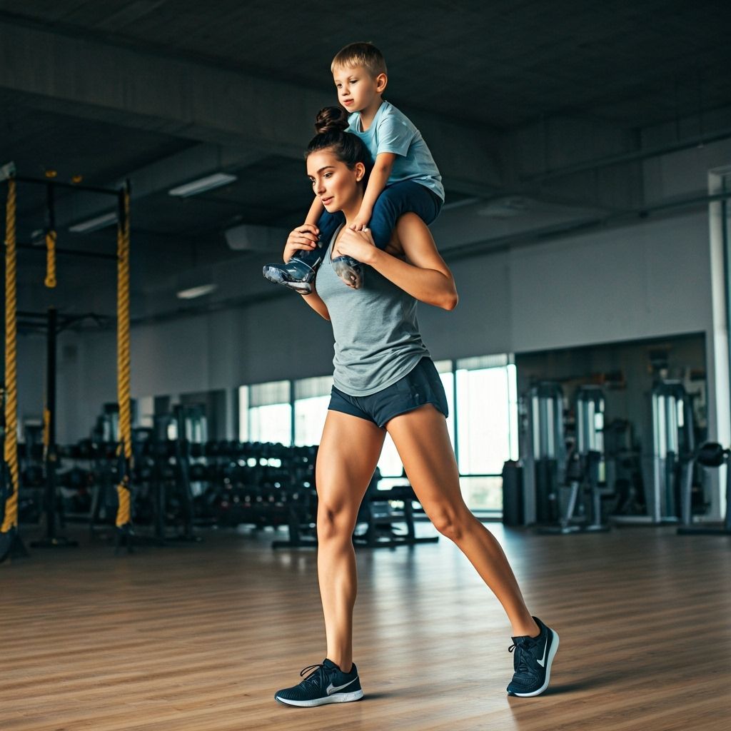 A photorealistic image of a tall, slim brunette woman carrying a boy on her shoulders in a bright, modern gym, captured with a shallow depth of field and natural lighting.