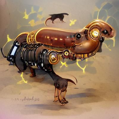 This image shows a steampunk cyborg dachshund. The artwork features intricate mechanical augmentations and a distinct steampunk aesthetic.