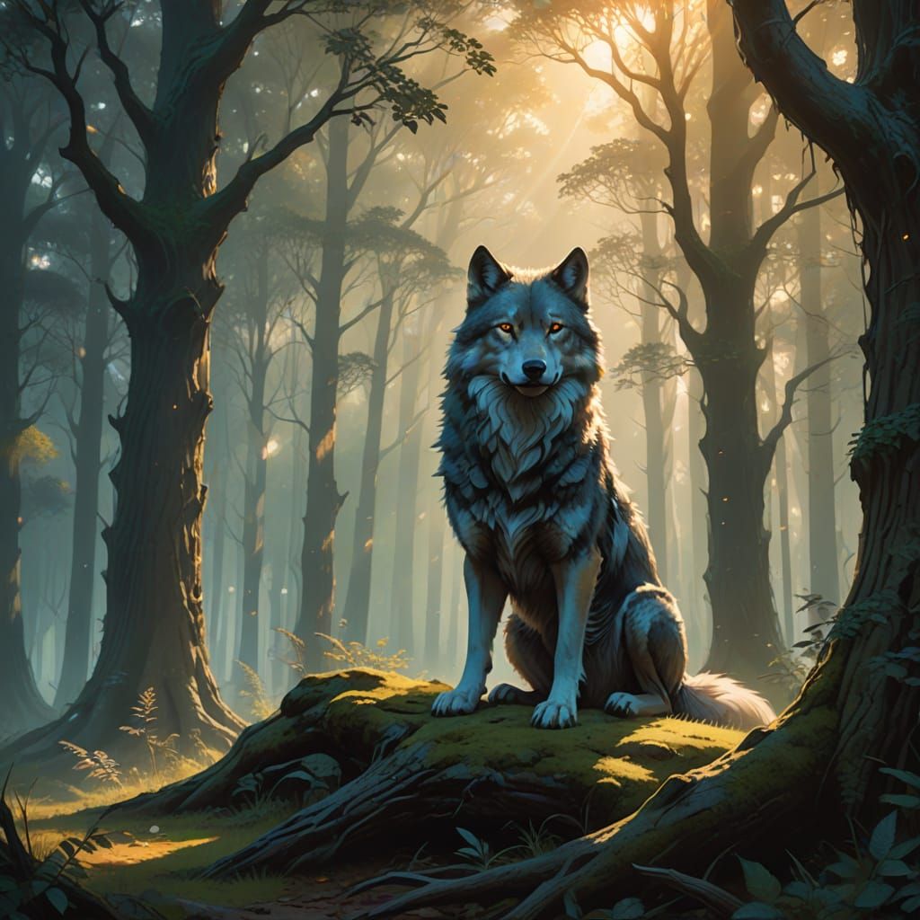 This fantasy concept art depicts a serene forest clearing with a majestic wolf. Ethereal light filters through ancient trees, creating a mystical atmosphere. Rendered with intricate details and soft volumetric lighting.