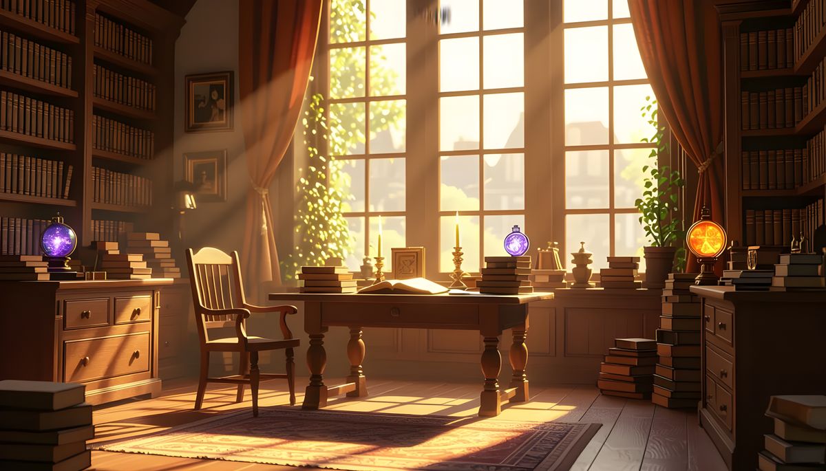 This 3D digital art depicts a cozy room bathed in sunlight from windows, featuring a desk, books, and a magical atmosphere. Rendered in a vibrant, cinematic style.