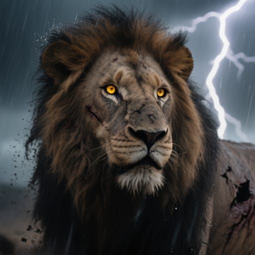 This image shows a close-up of a weathered lion, its mane dusted and eyes ablaze with resilience. A storm rages with rain and lightning, accentuating its scars in hyper-realistic detail.