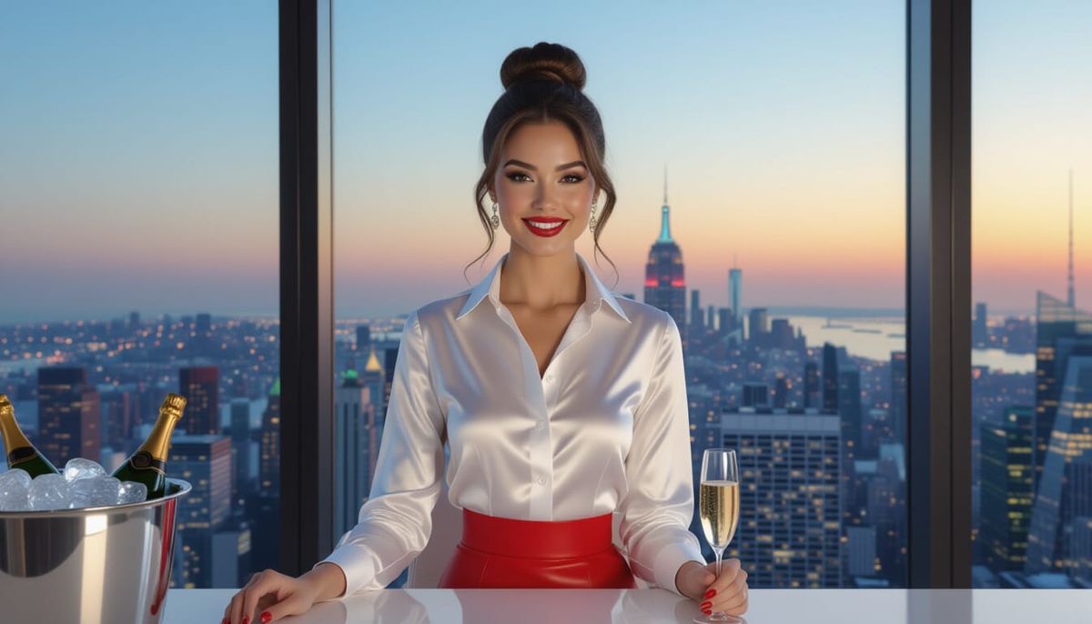 A photorealistic image of a brunette in business attire at a modern office desk. The background features a sunset city skyline, inspired by digital art and sleek futuristic designs.