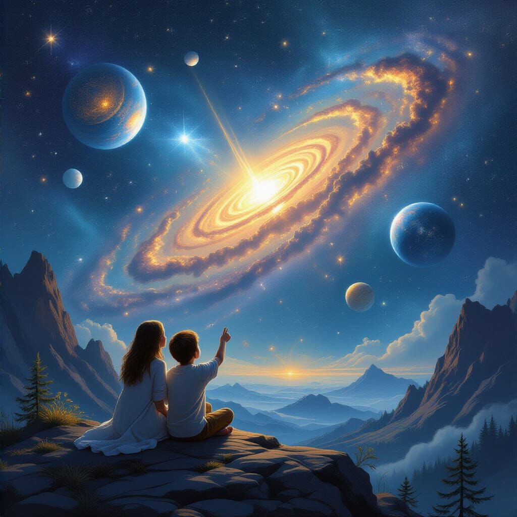 Мездузвездно пространство на един пухкав астероид със златисти отблясъци седят момче, светулка и гушкаво чудовище със искряща бяла козина и искрящи гладки рогца. Около тях планети и галактики. В далечината да има три фигури да се носят във пространството и да сочат една мъглявина.