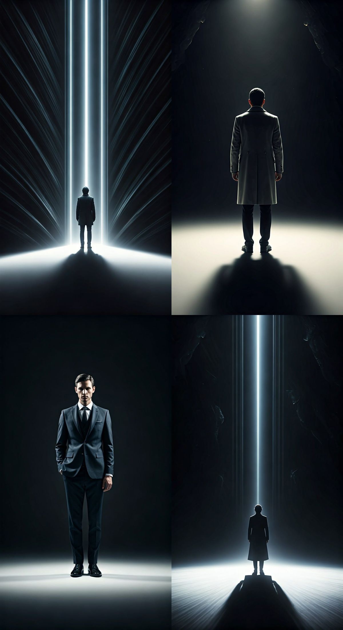 A figure stands on a white plane, facing infinity. The figure is well-dressed, with intricate details, captured in hyperrealistic HDR with high contrast and cinematic, atmospheric lighting.