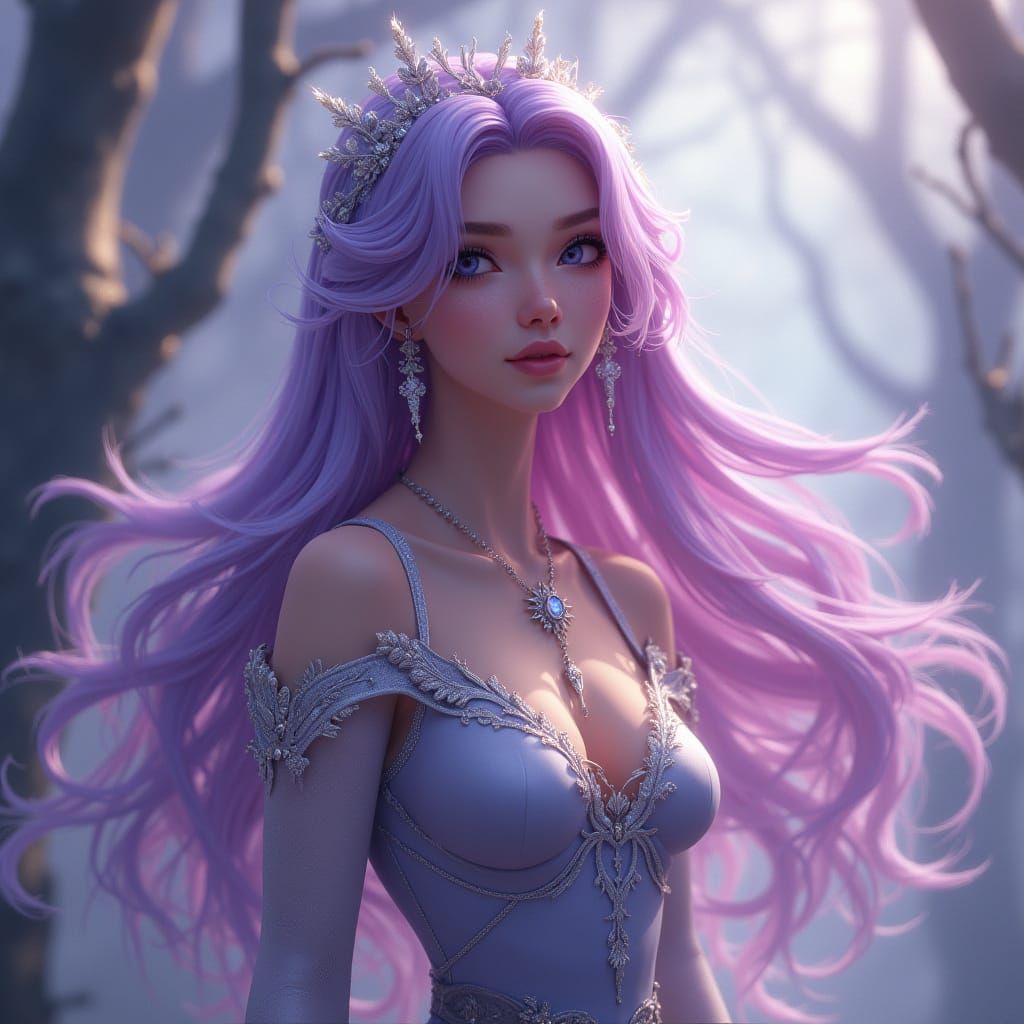 This image shows a beautiful witch with lilac hair who appears soft and gentle. The fantasy concept art features intricate details, deep colors, and complementary color schemes as a detailed matte painting.