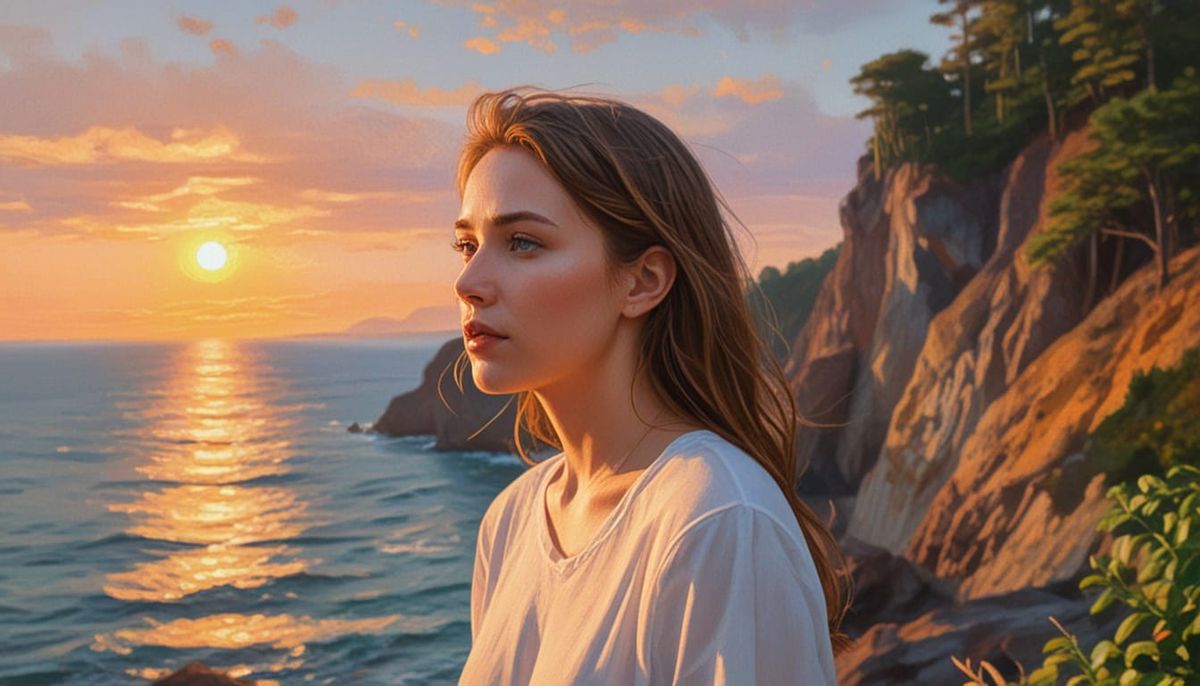 A vibrant oil painting of a woman watching the sunset from a forested cliff. This fauvist expressionist portrait captures the warm, golden light and nostalgic atmosphere with soft brushstrokes and gentle color gradients.