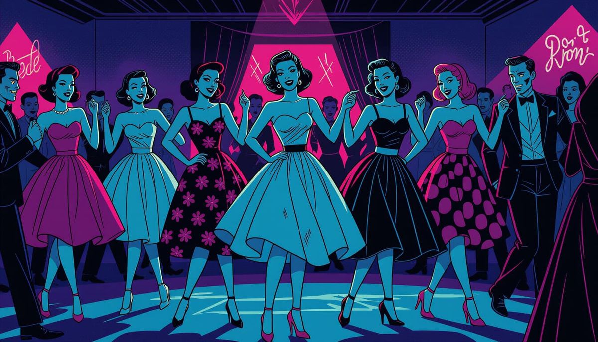 This image shows stylish, glamorous women in 1950s attire dancing at a retro zombie prom. Rendered in a vibrant, high-contrast comic book style with dramatic neon lighting.
