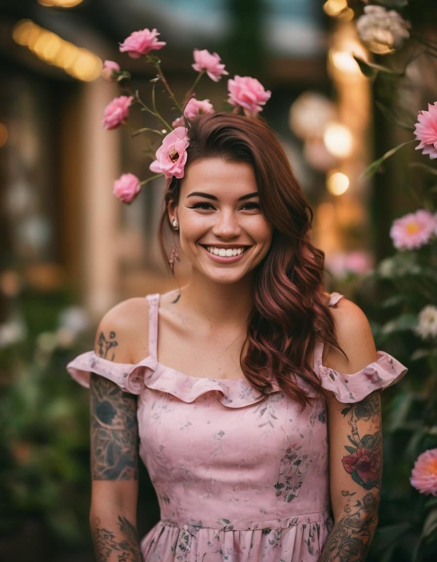 This image shows a medium shot portrait of a smiling young woman with tattoos. She is wearing a pink floral dress, with a soft focus background and warm, natural lighting. It's a high-quality photograph with vibrant colors.