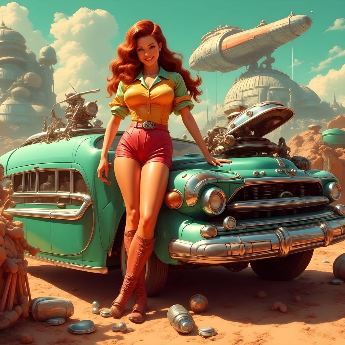 This image shows a pin-up style mechanic with auburn hair confidently leaning against a spaceship in a junkyard. Rendered as a cheerful, polished retro illustration with vibrant colors.