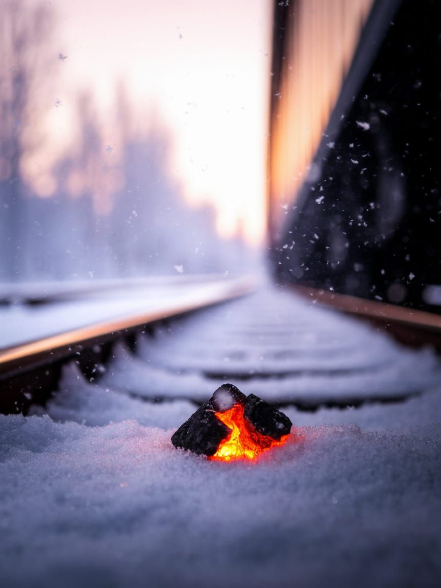 This macro photograph captures a single, glowing ember on a snow-covered train track, contrasting intense heat with the cold winter surroundings. Features shallow depth of field and bokeh effects.