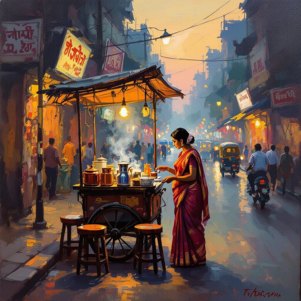 This image depicts a vibrant roadside tea stall in bustling Kolkata at dusk, captured in the bold, textured style of Indian folk art. Warm lamplight illuminates the lively street scene.