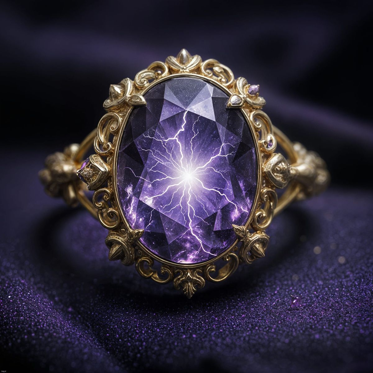 This image shows a close-up of a gold ring featuring a jewel of swirling purple energy. The jewelry is set against a dark background, rendered as an epic classical painting.