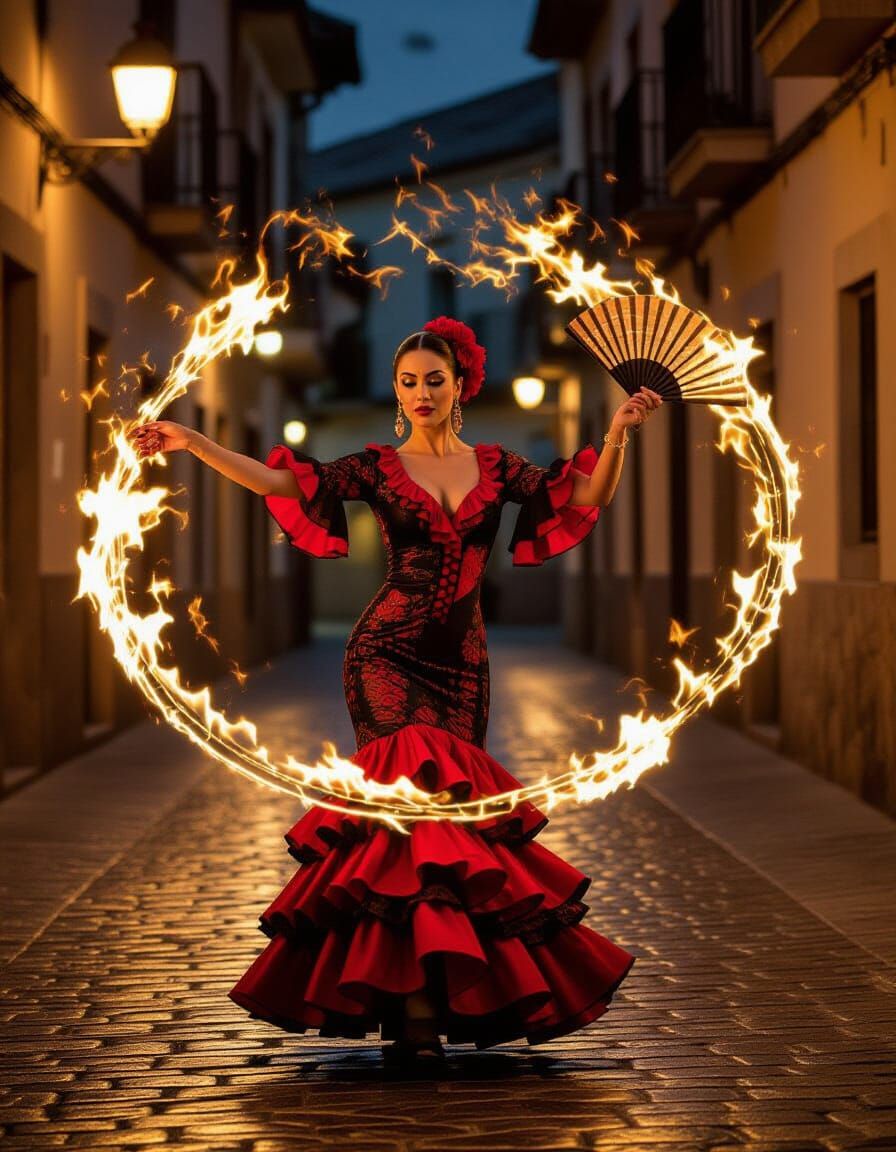 A passionate flamenco dancer moves through a Spanish street at night, her dress swirling with magical fire. Cinematic lighting highlights the vibrant, wet cobblestones.