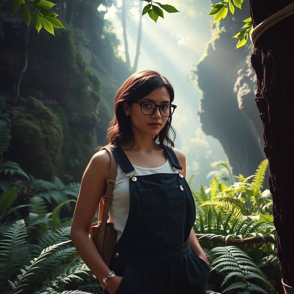 a dark brunette hair and eyeglasses fashionista in overalls with blank expression stare from the dense, prehistoric garden filled with ferns, moss and forest cliffs, sunlight filters through the canopy with air is thick with mist and humidity, atmospheric, stunning