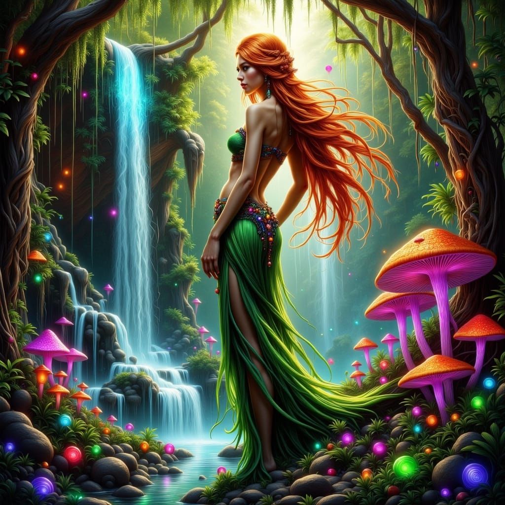 This image depicts a mystical forest nymph with vibrant orange locks adorned with glowing purple mushrooms, standing beside a serene waterfall, surrounded by lush foliage and dappled sunlight.