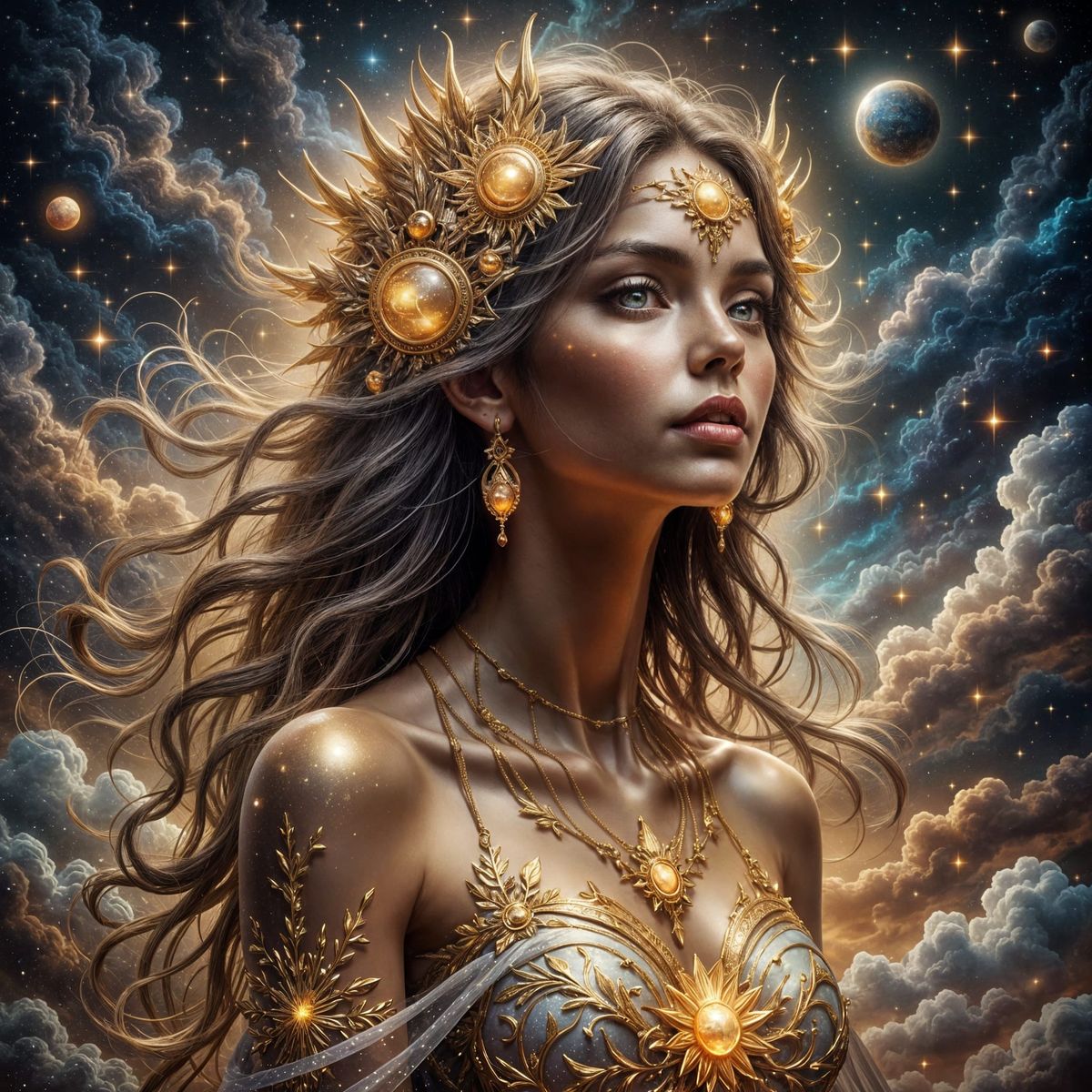 A striking picture of a celestial goddess in a mystical setting. The goddess has glowing skin and shimmering eyes, surrounded by a cosmic background and ornate celestial framing as digital art.