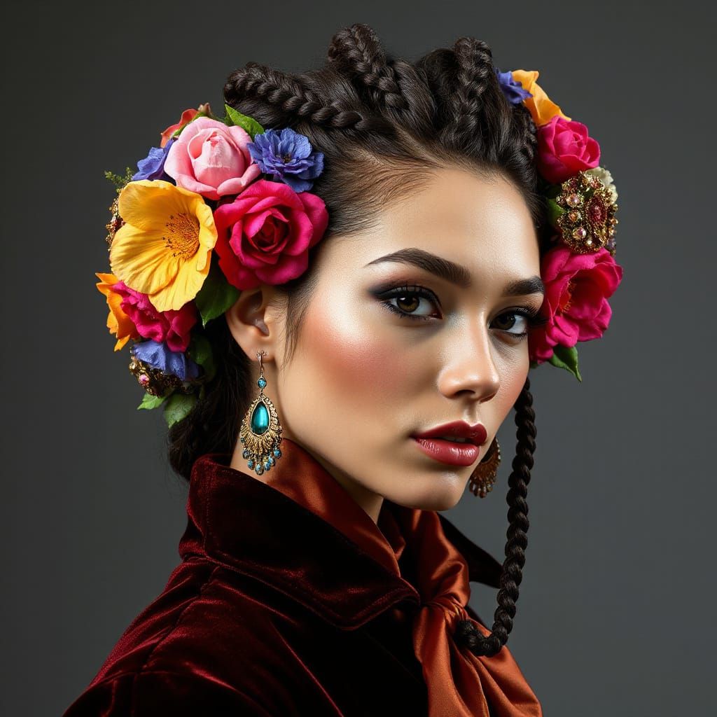 This image shows a fashion-forward woman with a complex braided hairstyle shaped like a colorful floral arrangement. Her velvet and silk clothing is rendered with hyperdetailed textures and dynamic lighting in a digital art style.