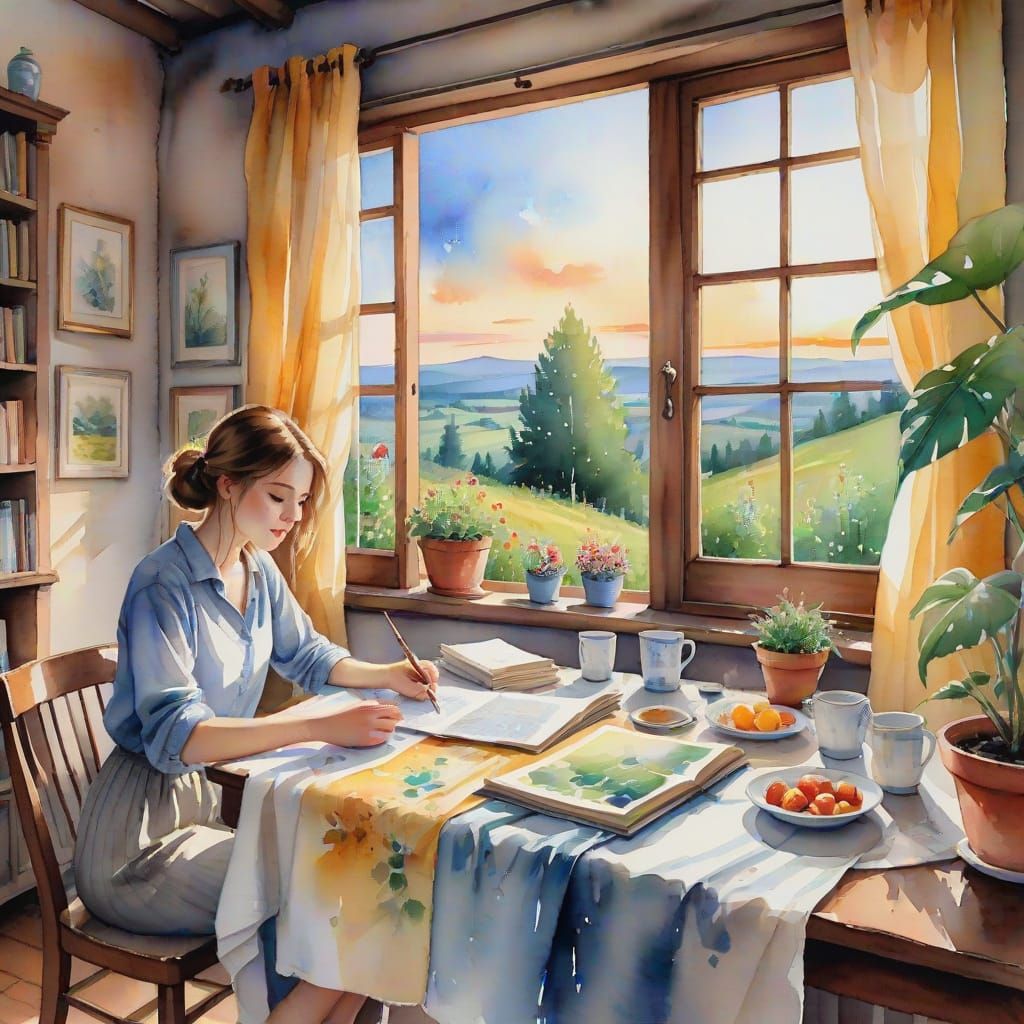 This image shows a cat reading a newspaper by a window with a cup of tea. The watercolor painting features warm lighting, soft brushstrokes, and a cozy atmosphere in pastel colors.