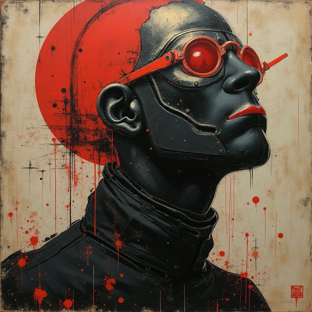 This image showcases a futuristic viper in a retro-brutalist style. The artwork features obscured, nihilistic elements with bright metal and copper details, reminiscent of mixed media with a touch of mysticism.