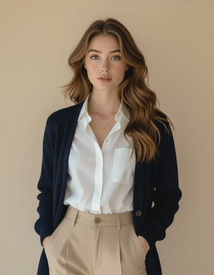 A young woman with light brown wavy hair, dressed in classic beige trousers, a white shirt, and a dark blue cardigan, is captured in a dramatic, atmospheric film still.