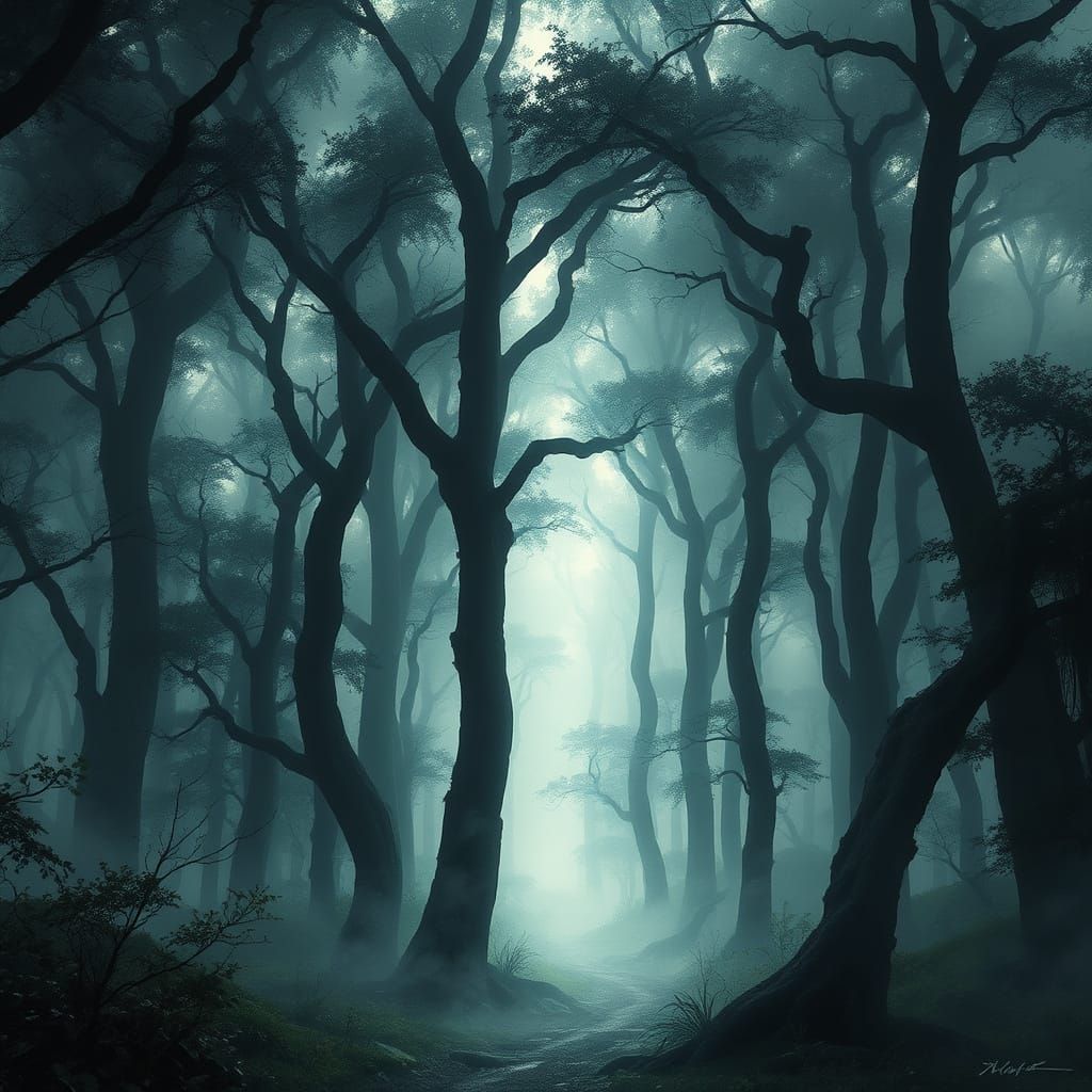 This image depicts a surreal, spectral forest with tangible shadows and ethereal whispers. Liquid silver light creates an otherworldly glow in this detailed matte painting.