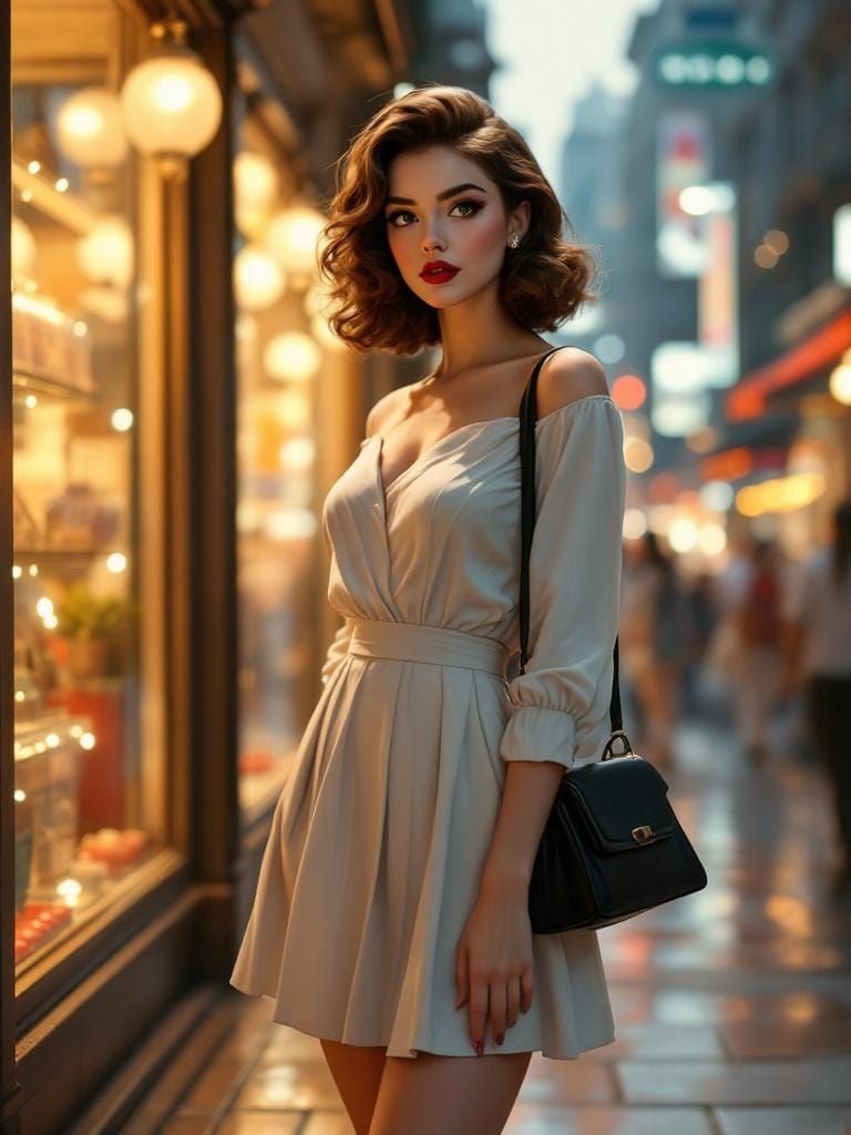 This image shows a confident woman on a city street. The artwork is reminiscent of anime art with painterly textures, soft lighting, and a focus on elegant details.
