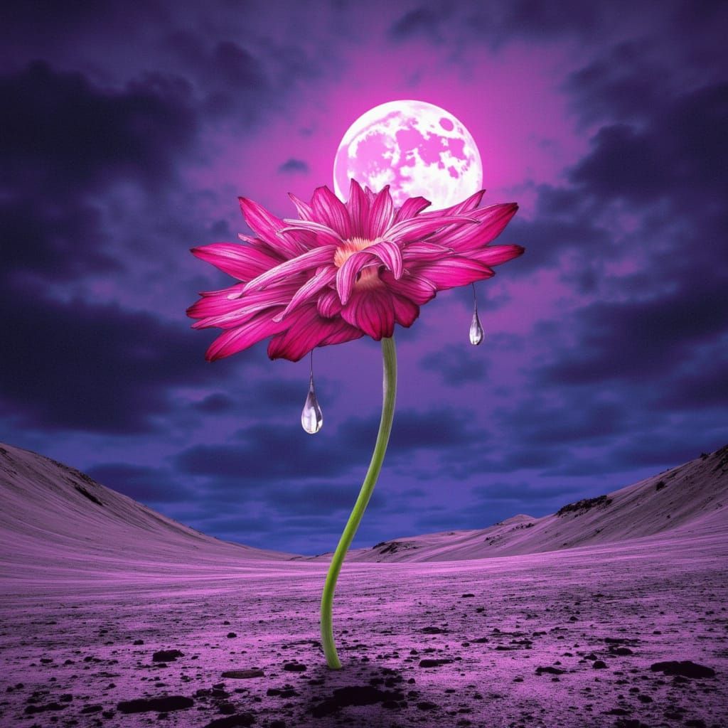 This image shows a solitary pink flower with glass-like petals on a desolate alien moon. The scene features a swirling nebula, a pink moon, and volumetric lighting, creating a sense of loneliness and stark contrast.
