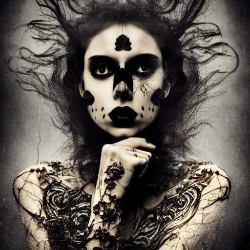 "smoke. intense white neon light. decaying yellow photographic paper. sepia color. old fashioned tintype. black and white photography. Surrealist portrait. Medium shot. Goth female fashion model. Moody atmosphere. High-fashion photography. Masterpiece. Best quality. Dark academia aesthetic. Vintage camera effects. Film grain. Moody color palette. Close up portrait, ambient light, Nikon 15mm f/1.8G, by Lee Jeffries, Alessio Albi, Adrian Kuipers"