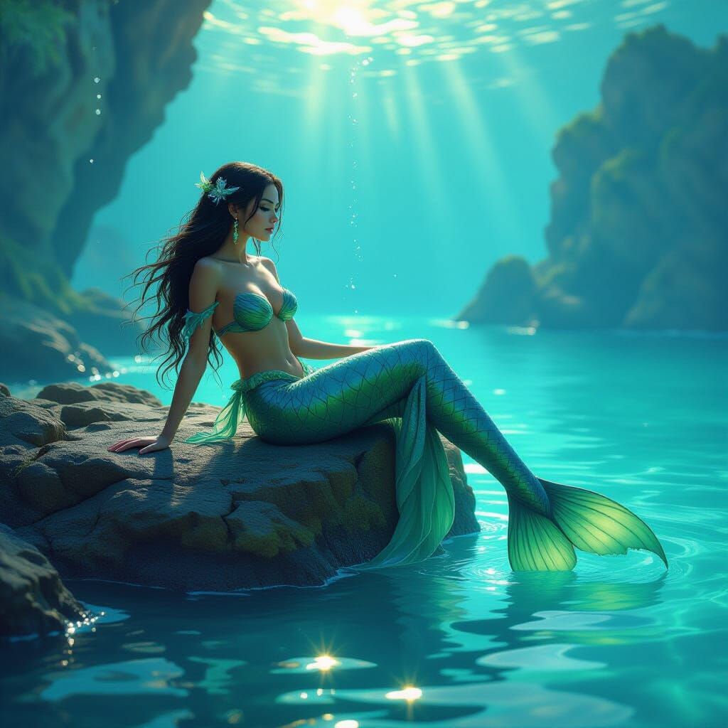 A mermaid with a flowing green tail rests on rocks overlooking turquoise waters. The image is a digital painting with jewel-toned colors, cinematic lighting, and an ethereal, magical aesthetic.