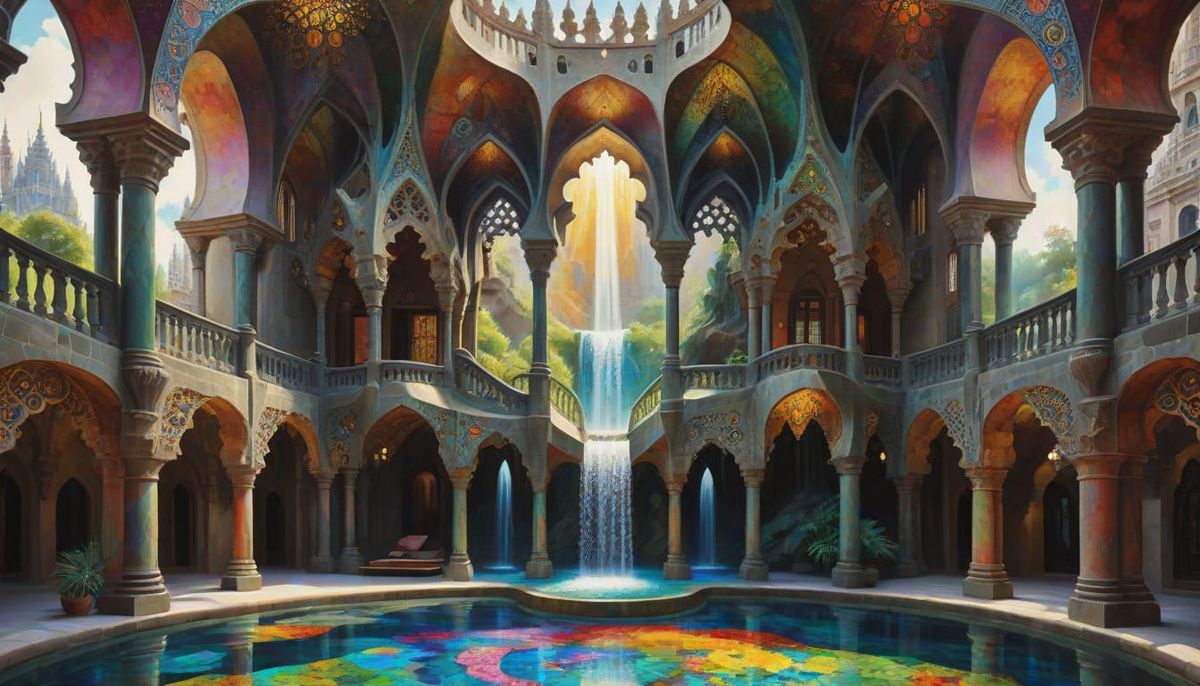 beautiful (gorgeous:1.6) (smiling African-asian women:1.6) (skinny dipping:1.5) in a freeform pool inside the attrium of an elf's mansion in Minas Tirith. (a waterfall:1.4) is passing through the building and feeding the freeform pool, A tall and narrow (4 floor:1.3) house (with 4 floors:1.3), (designed ...