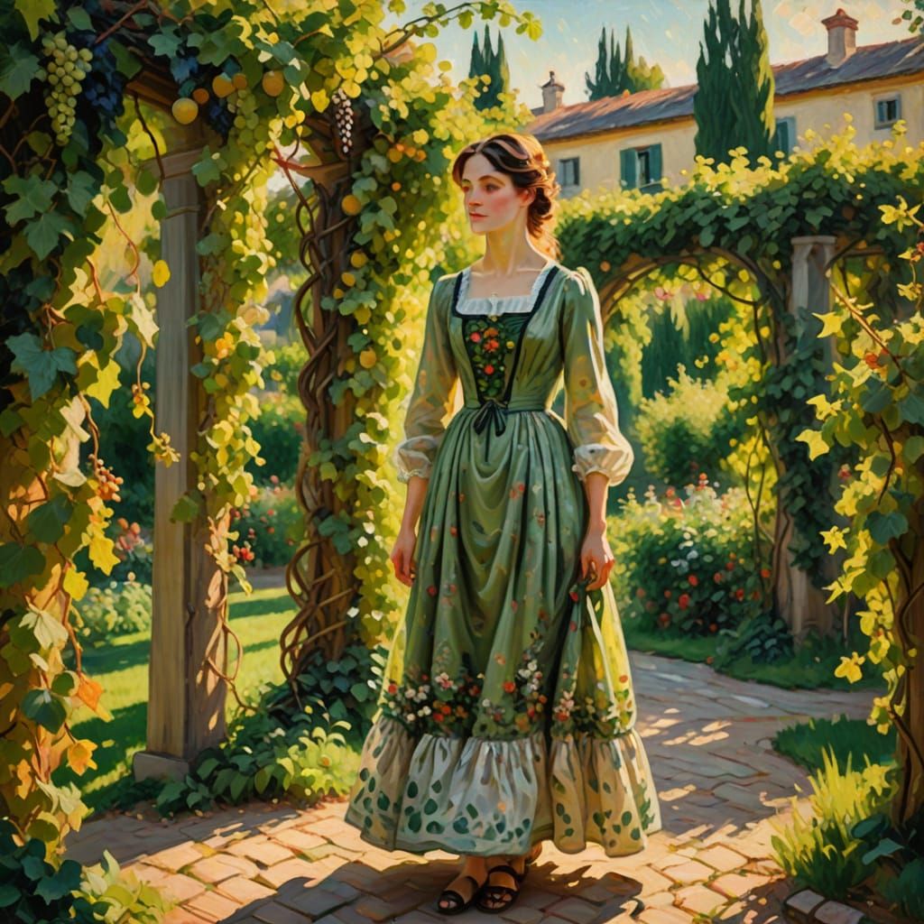 This image shows a serene woman in a lush green courtyard surrounded by a vibrant vineyard, with warm afternoon light and soft focus creating a dreamy atmosphere reminiscent of impressionist masters.