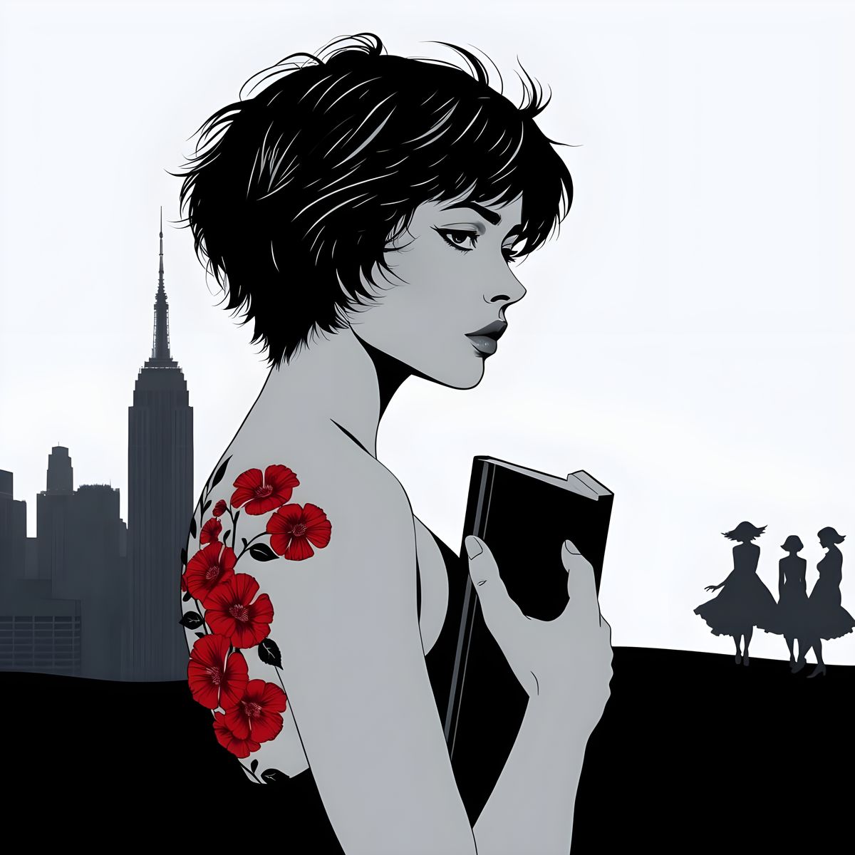 This detailed concept art portrait features a woman's silhouette with short hair and a determined expression, holding a book. A vibrant red floral tattoo contrasts with the background, showing NYC and distant figures.