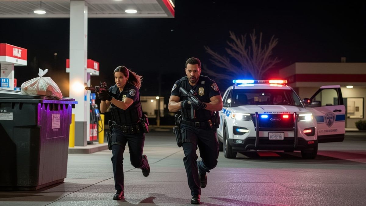 This image captures a dramatic police pursuit at a gas station under the cover of darkness, with officers hot on the heels of armed suspects fleeing in a van, amidst a cinematic lighting setup reminiscent of classic action films.