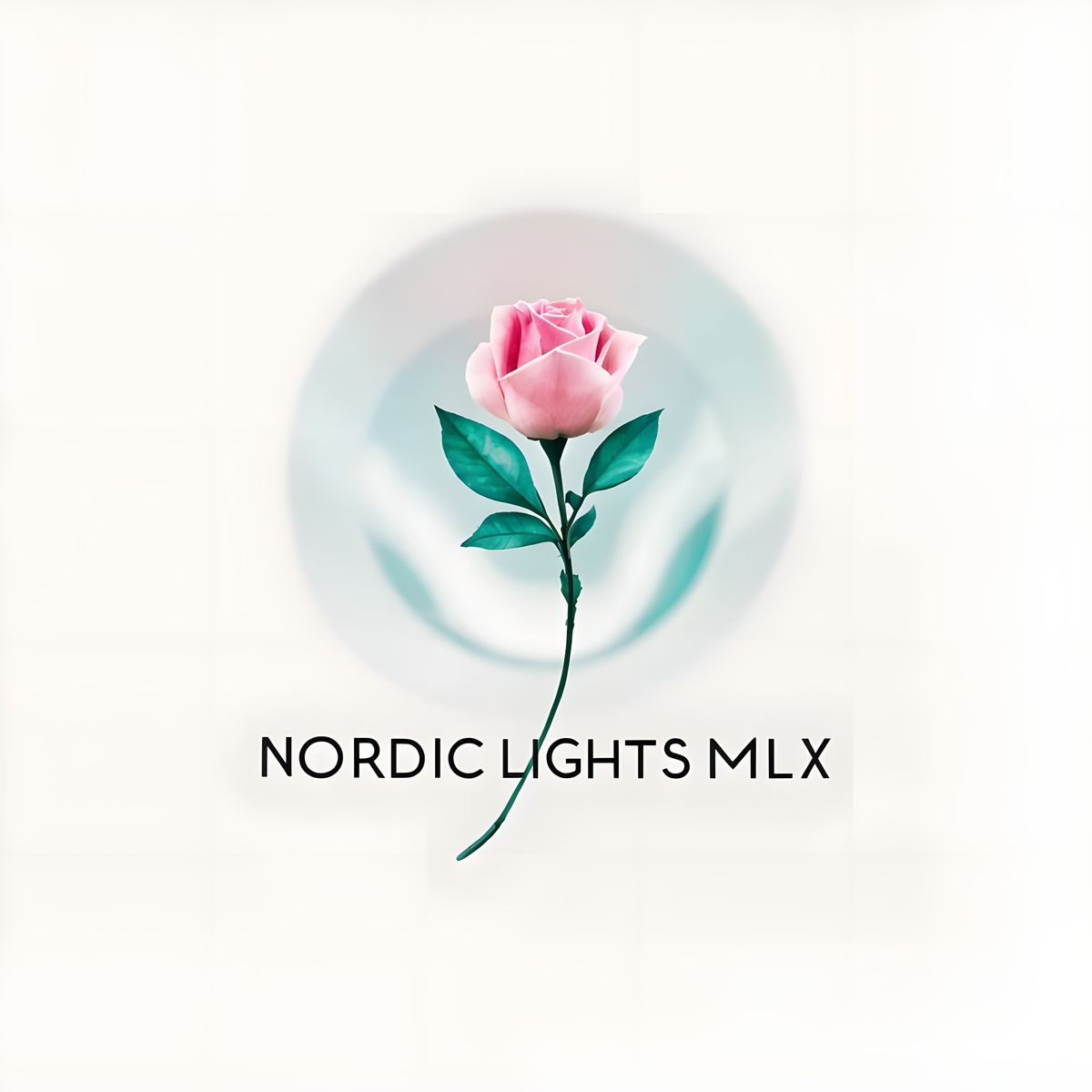 This image depicts a stunning rose-colored aurora borealis illuminating a snowy Nordic landscape with a single rose in focus. Created with digital art techniques.