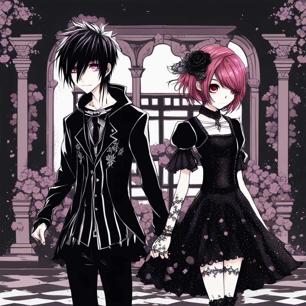 This image shows an anime-style illustration of an emo girl in a goth dress with an emo skater boy at prom. The art style is reminiscent of Japanese manga and anime key visuals.