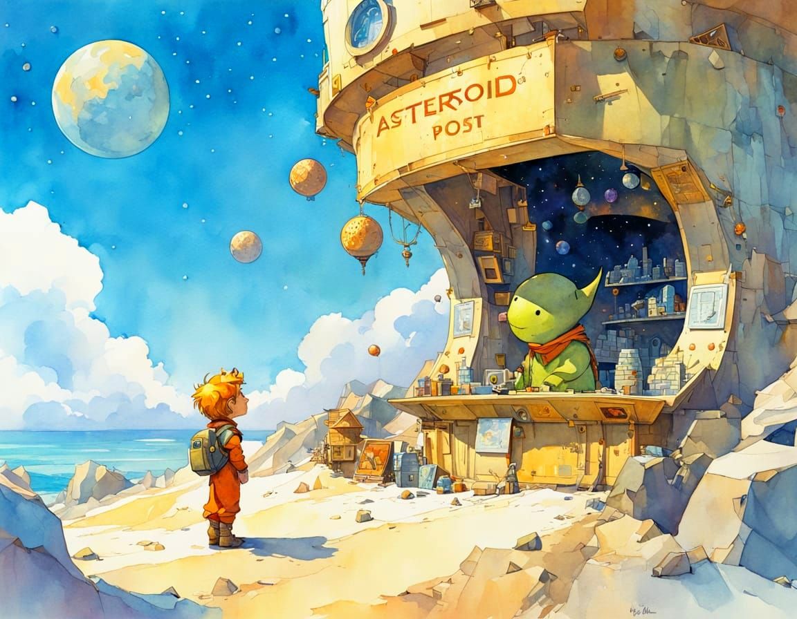 An asteroid with water and blue sky? I like the Antoine de St. Exupery type illustration! I could see this as a missing scene from THE LITTLE PRINCE.