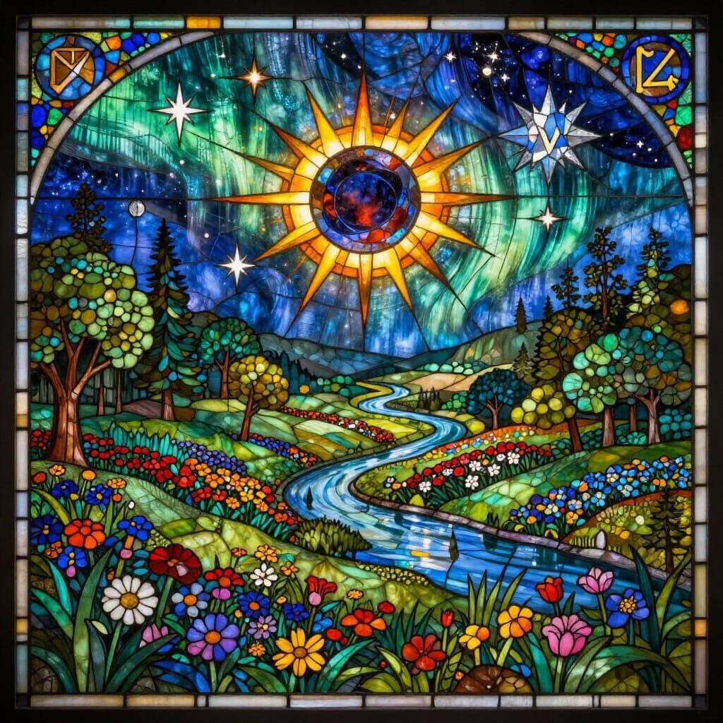 This image showcases a lush valley rendered in stained glass, featuring a dramatic solar eclipse, aurora, and celestial symbols. Inspired by illuminated manuscripts and art nouveau.