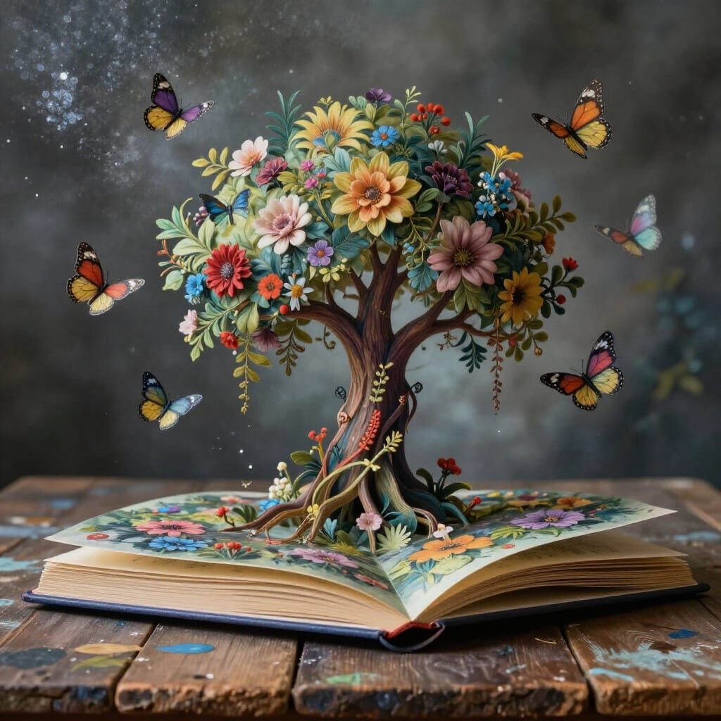 This image features a hyperdetailed 3D pop-up book art piece. It blends abstract surrealism with arabesque elements, set against a pearlescent, misty background with glowing highlights.