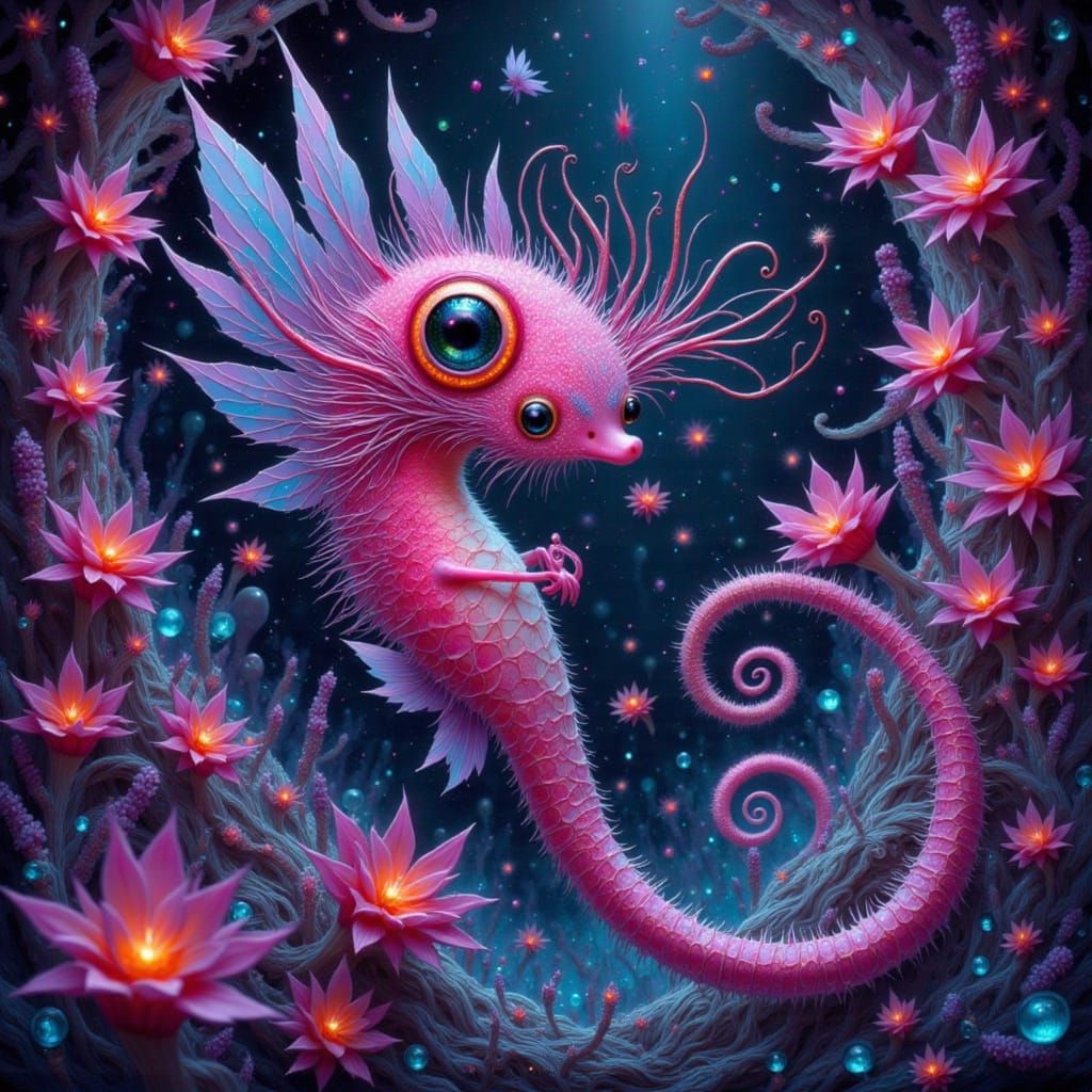 This image shows a miniature, glowing, winged seahorse with large eyes perched on neon plants in a crystal cave. The scene has a dreamy, ethereal quality with bioluminescent flora and a fairy punk aesthetic.